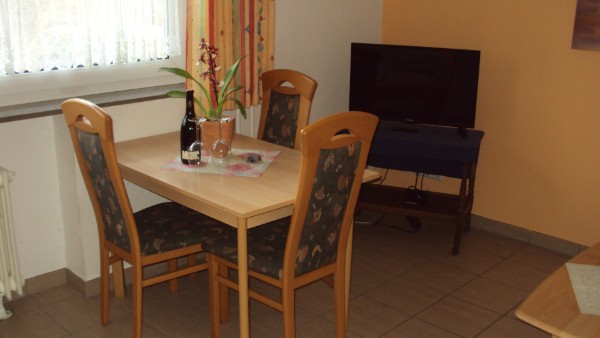 Der Wohn-/Schlafraum beinhaltet sowohl eine Sitzgarnitur für 4 Personen als auch einen Eßtisch,